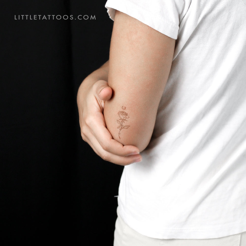 Set of three moon rose temporary tattoo, composed of a beautiful fine line style rose and a crescent moon, designed by Jakenowicz.