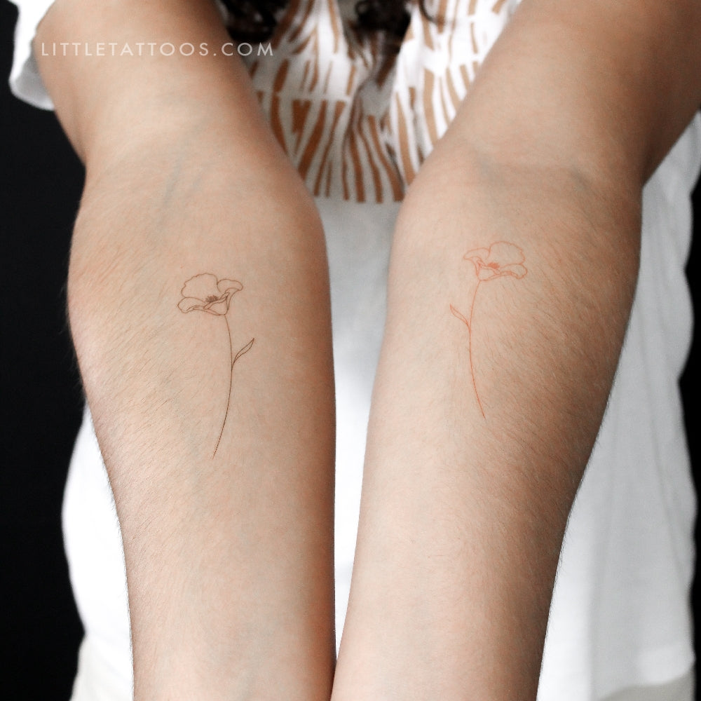 Fine line style poppy couple temporary tattoo set designed by single needle tattoo master Jakenowicz. The set includes two copies of each design.